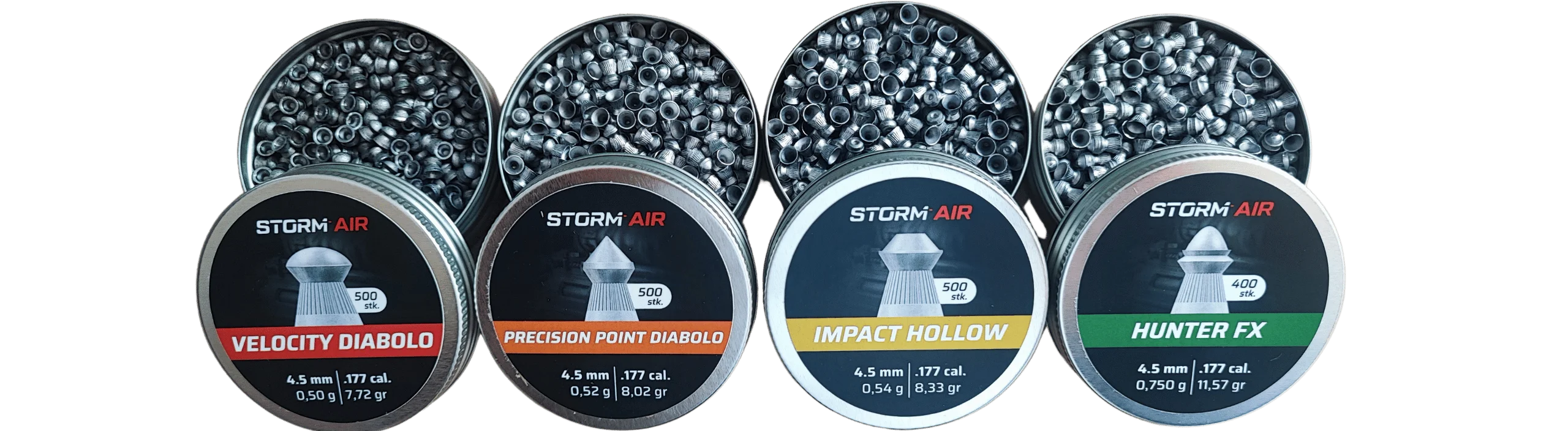 Her kan du prøve hele vores udvalg af Storm Air luftgeværhagl - Du køber her en prøvepakke med 4 æsker hagl med Hunter FX, Impact Hollow, Precision Point Diabolo og Velocity Diabolo.