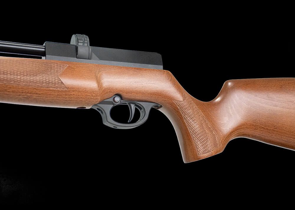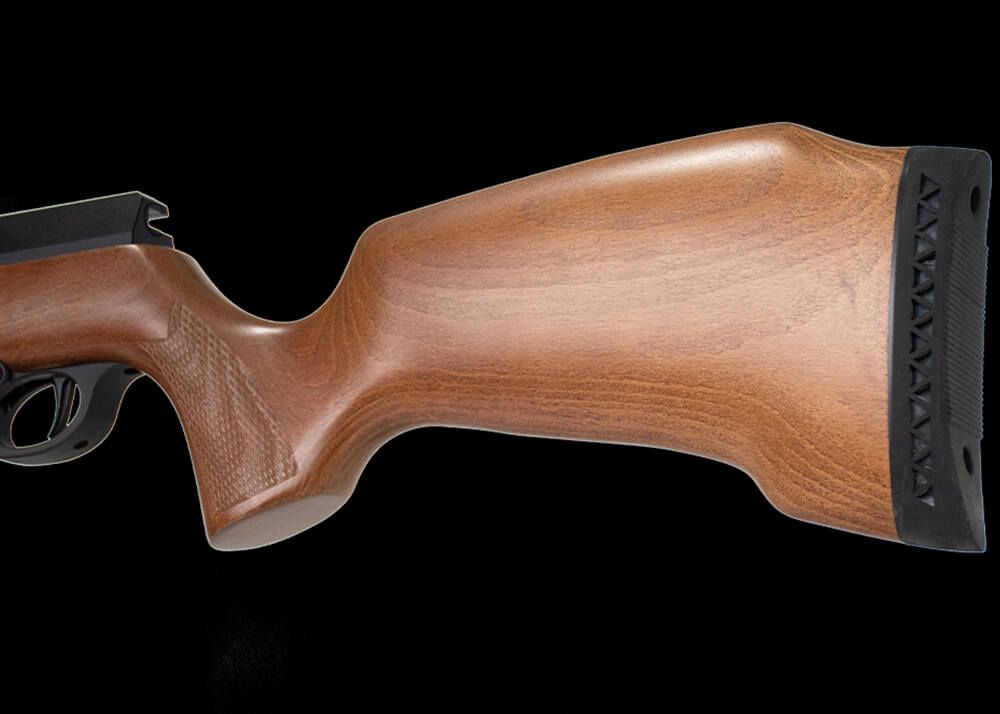 Kolben er lavet af træ med en hævet kindpude og gummiskulderknap, der giver god komfort og korrekt skydeposition. Riflen er ambidekster, så den passer til både højre- og venstrehåndede skytter.